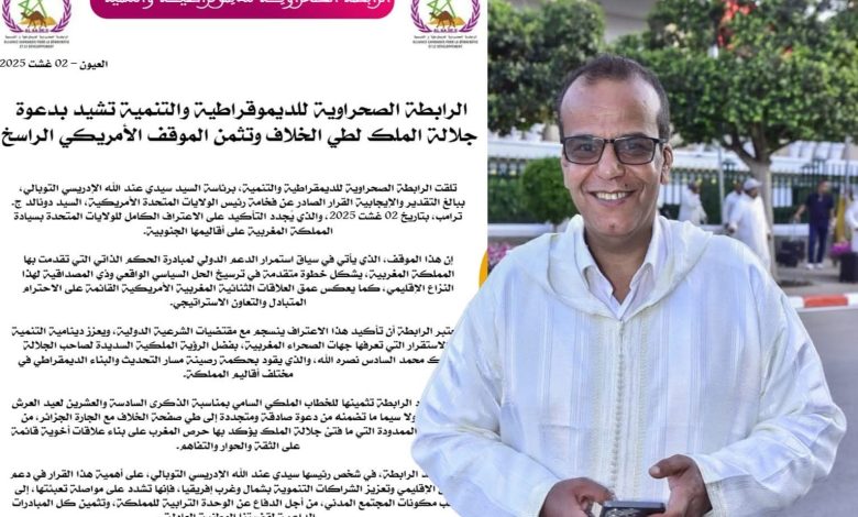 تلقت الرابطة الصحراوية للديمقراطية والتنمية، برئاسة السيد سيدي عند الله الإدريسي التوبالي، ببالغ التقدير والإيجابية القرار الصادر عن فخامة رئيس الولايات المتحدة الأمريكية، السيد دونالد ج. ترامب، بتاريخ 02 غشت 2025، والذي يُجدد التأكيد على الاعتراف الكامل للولايات المتحدة بسيادة المملكة المغربية على أقاليمها الجنوبية.