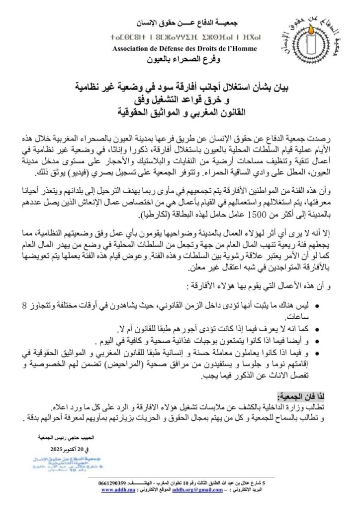 رصدت جمعية الدفاع عن حقوق الإنسان عن طريق فرعها بمدينة العيون بالصحراء المغربية خلال هذه الأيام عملية قيام السلطات المحلية بالعيون باستغلال أفارقة، ذكورا وإناثا، في وضعية غير نظامية في أعمال تنقية وتنظيف مساحات أرضية من النفايات والبلاستيك والأحجار على مستوى مدخل مدينة العيون، المطل على وادي الساقية الحمراء. وتتوفر الجمعية على تسجيل بصري (فيديو) يوثق ذلك.