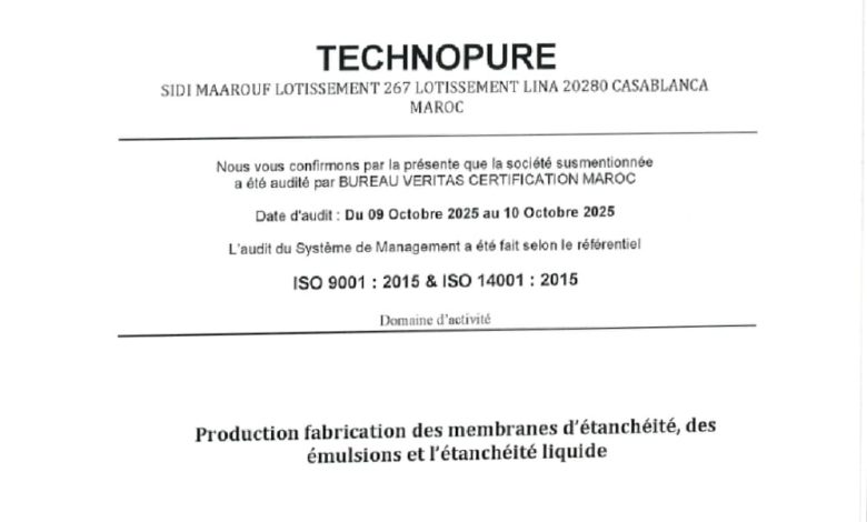 وقالت المصادر نفسها، إن حصول شركة تكنوبور المغرب على شهادتي الجودة، يأتي تتويجًا لمسار طويل من الالتزام بالجودة، والسلامة، وحماية البيئة.
