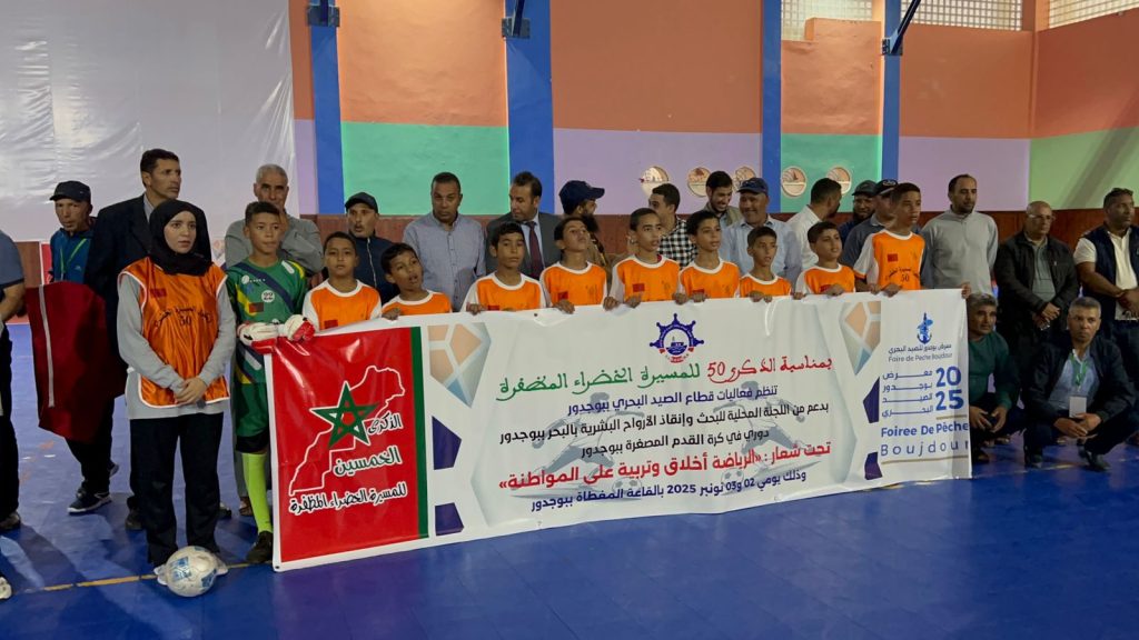 في إطار الاحتفالات المخلدة للذكرى الخمسين لانطلاق المسيرة الخضراء المظفرة، وتأكيداً على الروح الوطنية والوحدة الترابية للمملكة، نظم قطاع الصيد البحري بمدينة بوجدور دورياً مصغراً ناجحاً لكرة القدم.