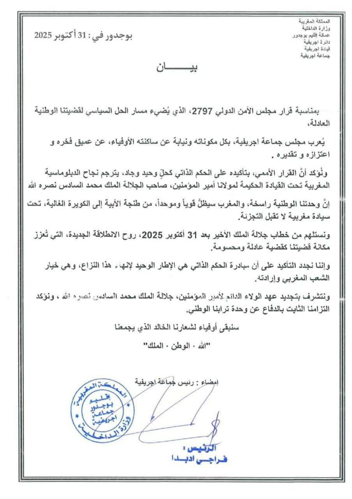بمناسبة صدور قرار مجلس الأمن الدولي رقم 2797 ، الذي يشكل محطة مضيئة في مسار إيجاد حل سياسي ونهائي لقضيتنا الوطنية العادلة، يعرب مجلس جماعة اجريفية، بكل مكوناته ونيابة عن ساكنته الأوفياء، عن فخره واعتزازه وامتنانه العميق لما تضمنه هذا القرار من دعم واضح لمبادرة الحكم الذاتي كحل جاد وواقعي تحت السيادة المغربية.