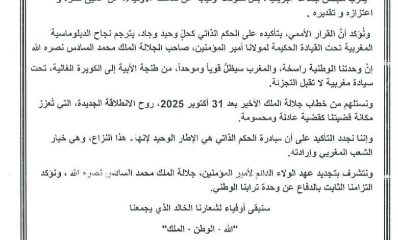 ويؤكد المجلس أن هذا القرار الدولي يعكس نجاح الدبلوماسية المغربية التي يقودها مولانا أمير المؤمنين صاحب الجلالة الملك محمد السادس نصره الله وأيده بكل حكمة ورؤية استراتيجية، في ترسيخ شرعية الموقف المغربي، وتزايد الدعم الدولي لمبادرة الحكم الذاتي كخيار وحيد لإنهاء النزاع المفتعل.