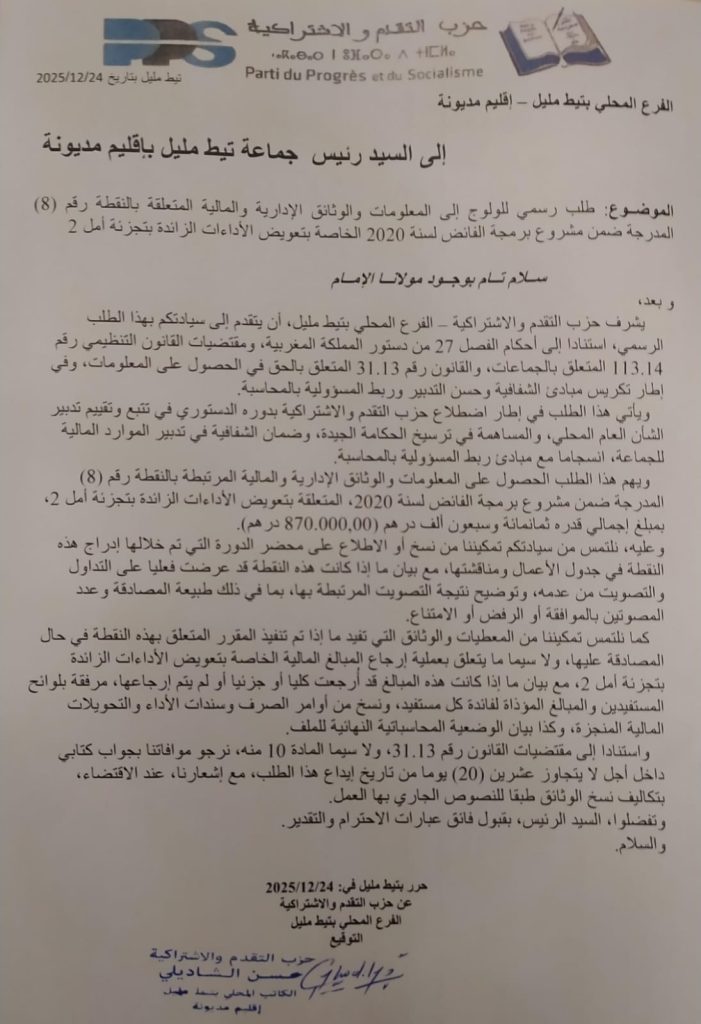 أعاد حزب التقدم والاشتراكية، عبر فرعه المحلي بتيط مليل، فتح ملف تعويض الأداءات الزائدة المرتبطة بتجزئة أمل 2، وذلك من خلال طلب رسمي وُجّه إلى رئاسة المجلس الجماعي، يرمي إلى الولوج إلى معلومات ووثائق إدارية ومالية تتعلق بالنقطة رقم (8) المدرجة ضمن مشروع برمجة الفائض لسنة 2020.