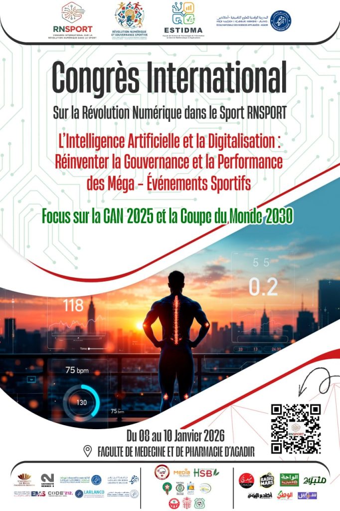 تحتضن المدرسة الوطنية للعلوم التطبيقية بأكادير، خلال الفترة الممتدة من 8 إلى 10 يناير 2026، أشغال المؤتمر الدولي «الثورة الرقمية في الرياضة» (RNSPORT 2026)، المنظم تحت شعار: «الذكاء الاصطناعي والرقمنة: نحو تجديد حكامة وأداء التظاهرات الرياضية الكبرى – على ضوء تنظيم كأس إفريقيا للأمم 2025 وكأس العالم 2030»، وذلك في سياق التحولات العميقة التي يشهدها القطاع الرياضي على المستويين الوطني والدولي، في ظل تسارع الرقمنة وتنامي دور الابتكار والذكاء الاصطناعي.