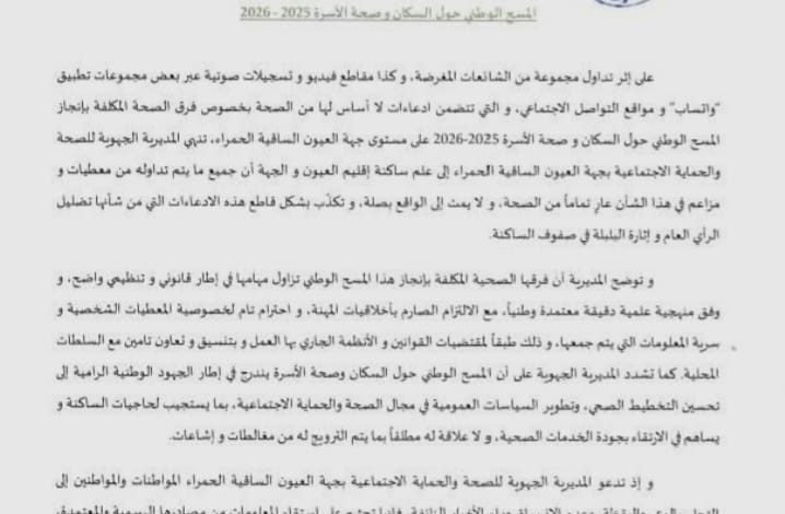 أصدرت المديرية الجهوية للصحة والحماية الاجتماعية بجهة العيون الساقية الحمراء، يوم 13 يناير 2026، بلاغًا توضيحيًا ردّت فيه على ما تم تداوله مؤخرًا عبر بعض منصات التواصل الاجتماعي، بخصوص مزاعم وشائعات مرتبطة بعمل الفرق الصحية المكلفة بإنجاز المسح الوطني حول السكان وصحة الأسرة 2025-2026.