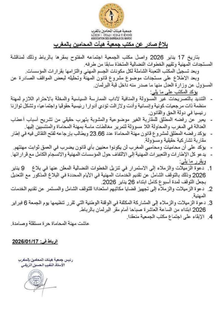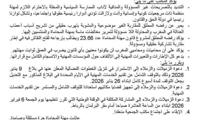 أعلن محامو المغرب عن توقف شامل ودائم عن تقديم جميع الخدمات المهنية، ابتداءً من 26 يناير 2026، في خطوة تصعيدية غير مسبوقة في تاريخ مهنة المحاماة بالمملكة.