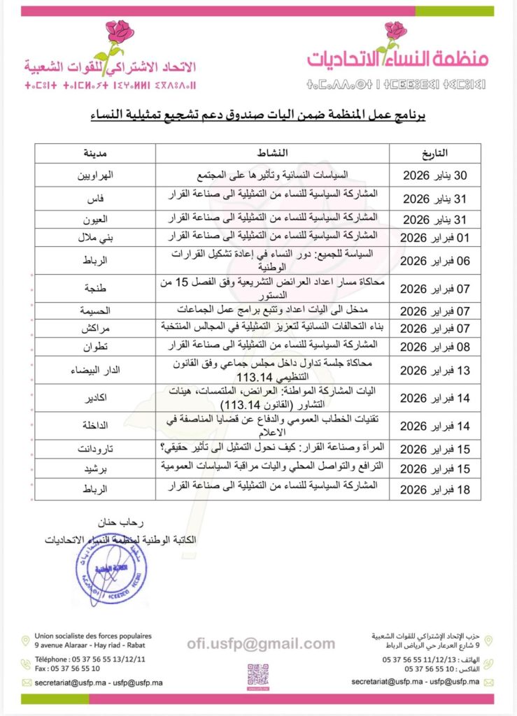 أطلقت منظمة النساء الاتحاديات، بشراكة مع صندوق الدعم لتشجيع تمثلية النساء التابع لوزارة الداخلية، سلسلة من اللقاءات التأطيرية والتكوينية في إطار مشروع «المشاركة السياسية للنساء: من التمثيلية إلى صناعة القرار»، والتي انطلقت في 30 يناير وتمتد إلى غاية 18 فبراير 2026، بعدد من المدن المغربية، بهدف تعزيز المشاركة السياسية للنساء وتقوية حضورهن في مواقع التأثير وصناعة القرار.