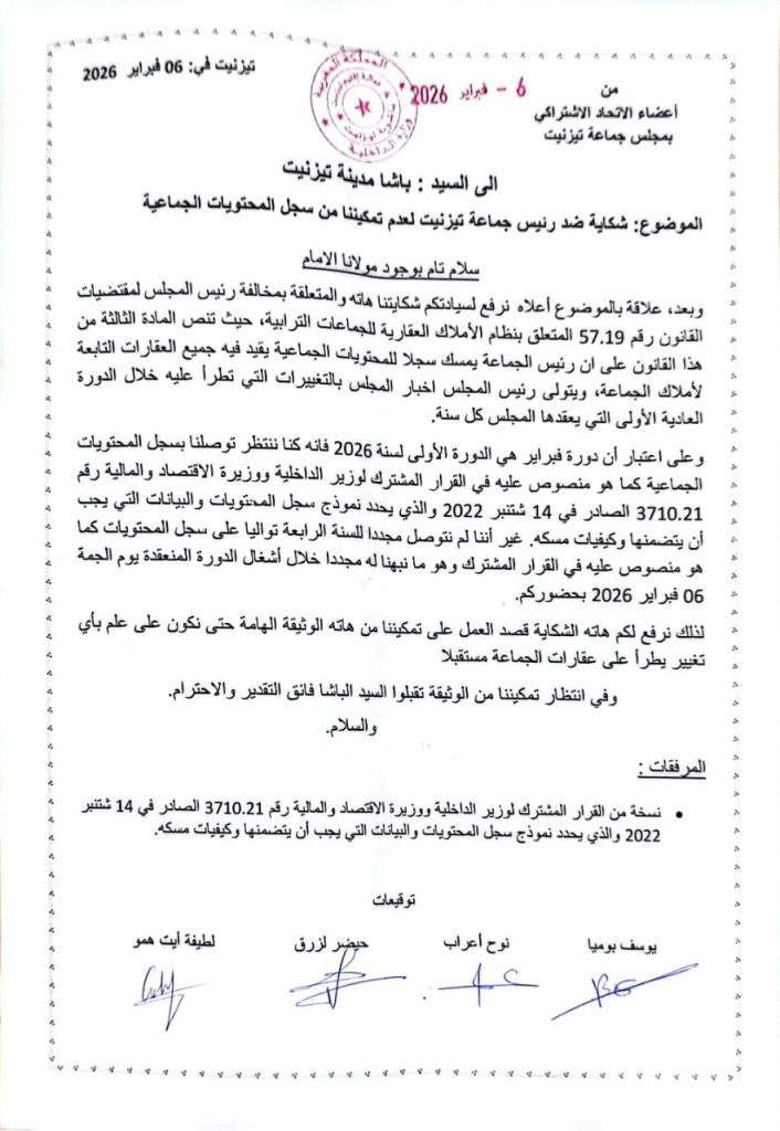 وفي هذا السياق، تتوفر جريدة الوطن بريس على نسخة من الشكاية الرسمية التي تقدمت بها معارضة المجلس إلى السيد باشا مدينة تيزنيت، والتي توثق قانونيًا لهذا الخرق، وتلتمس من خلالها تدخل السلطة المحلية قصد فرض احترام القانون وتمكين المجلس من سجل المحتويات الجماعية، باعتباره أداة أساسية للتتبع والمراقبة وحماية الملك الجماعي.