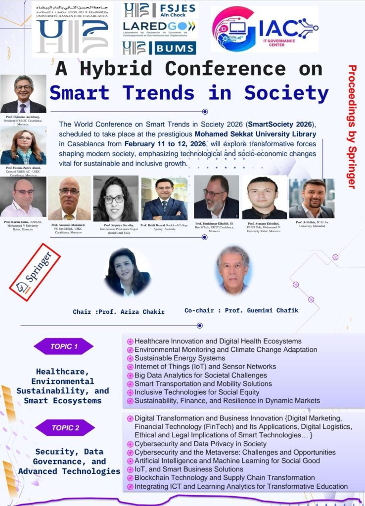 تحتضن كلية العلوم القانونية والاقتصادية والاجتماعية عين الشق (FSJES AC) بمدينة الدار البيضاء، يومي 11 و12 فبراير 2026، أشغال المؤتمر العالمي حول الاتجاهات الذكية في المجتمع (SmartSociety 2026)، وهو حدث دولي يسلّط الضوء على التحولات العميقة التي تعرفها المجتمعات الحديثة في ظل التسارع التكنولوجي والتحولات الاجتماعية والاقتصادية المتواصلة.