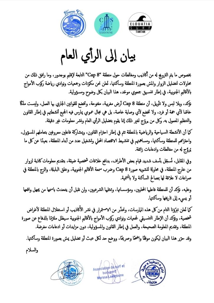 وجاء في البيان، الصادر في إطار تنسيق جمعوي موحد، أن المنطقة “أرض مغربية مفتوحة، تخضع للقوانين الجاري بها العمل”، نافيًا بشكل قاطع ما يتم تداوله من ادعاءات حول كونها منطقة مغلقة أو خاضعة لأي وصاية خاصة. وأكدت الهيئات الموقعة أن Cap 8 ليست ملكًا خاصًا لأي جهة أو فرد، بل هي مجال عمومي تُمارَس فيه الأنشطة وفق القانون والتنظيم المعمول به.