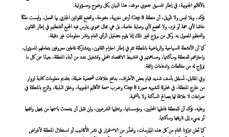 وفي المقابل، عبّر البيان عن أسف الموقعين لما اعتبروه “محاولات لتضليل الزوار من خارج المنطقة عبر تقديم معطيات مغلوطة”، مرجعين ذلك إلى “خلافات شخصية ضيقة” تسعى – بحسب تعبيرهم – إلى تشويه صورة Cap 8 وضرب سمعة الأقاليم الجنوبية.