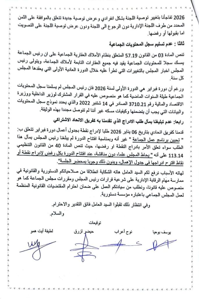 ويزداد المشهد قتامة حين يتم تجاهل طلبات الفرق داخل المجلس، كما وقع مع طلب إدراج نقطة تتعلق بتحيين برنامج عمل الجماعة، الذي قُدم داخل الآجال القانونية دون أن يتم إخبار المجلس بمآله، لا قبولًا ولا رفضًا، في مخالفة صريحة للقانون التنظيمي المنظم لعمل الجماعات.