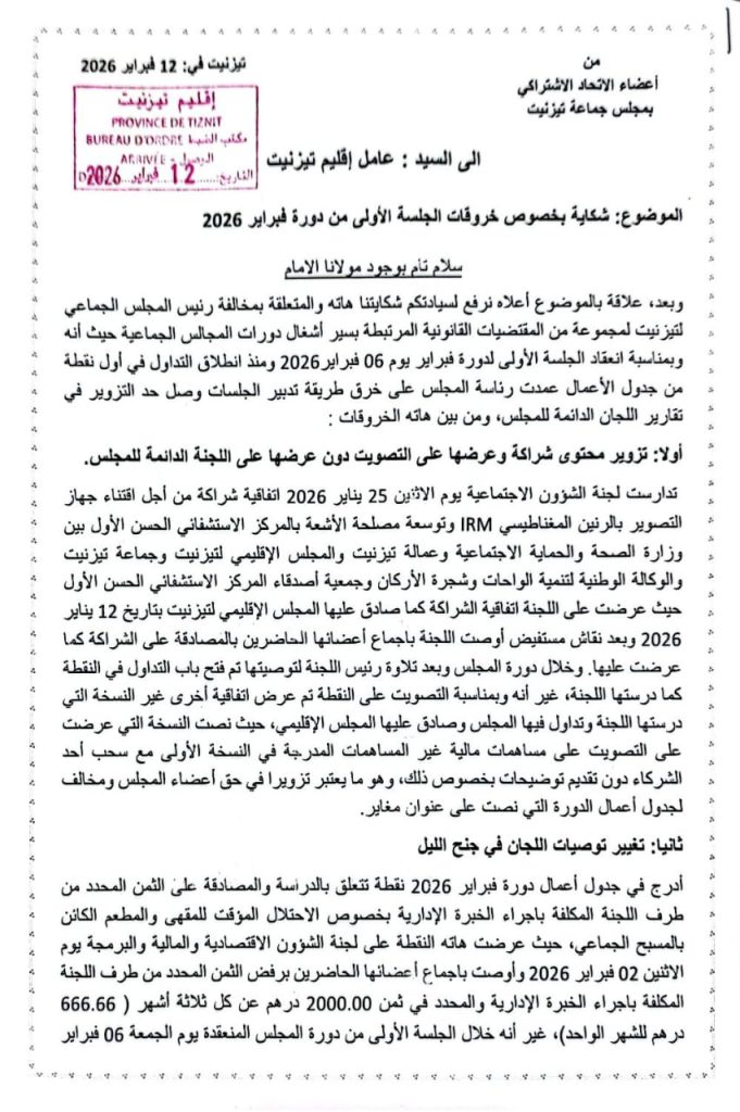 لم تعد إشكالية تدبير دورات المجالس الجماعية مقتصرة على ضعف النقاش أو محدودية المخرجات، بل أضحت، في بعض الحالات، عنوانًا لانزلاقات خطيرة تمس جوهر الشرعية الديمقراطية ومبدأ سيادة القانون. وهو ما تجلّى بوضوح خلال الجلسة الأولى من دورة فبراير 2026 للمجلس الجماعي لتيزنيت، التي تحوّلت، للأسف، من فضاء للتداول المسؤول إلى مسرح لممارسات تطرح أكثر من علامة استفهام.
