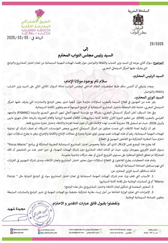 وجاء هذا التحرك البرلماني في سياق تساؤلات متزايدة داخل الأوساط المهنية حول كيفية تدبير عدد من المبادرات المرتبطة بتطوير الكتابة السينمائية واختيار المشاريع التي تمثل المغرب في التظاهرات والأسواق الدولية.