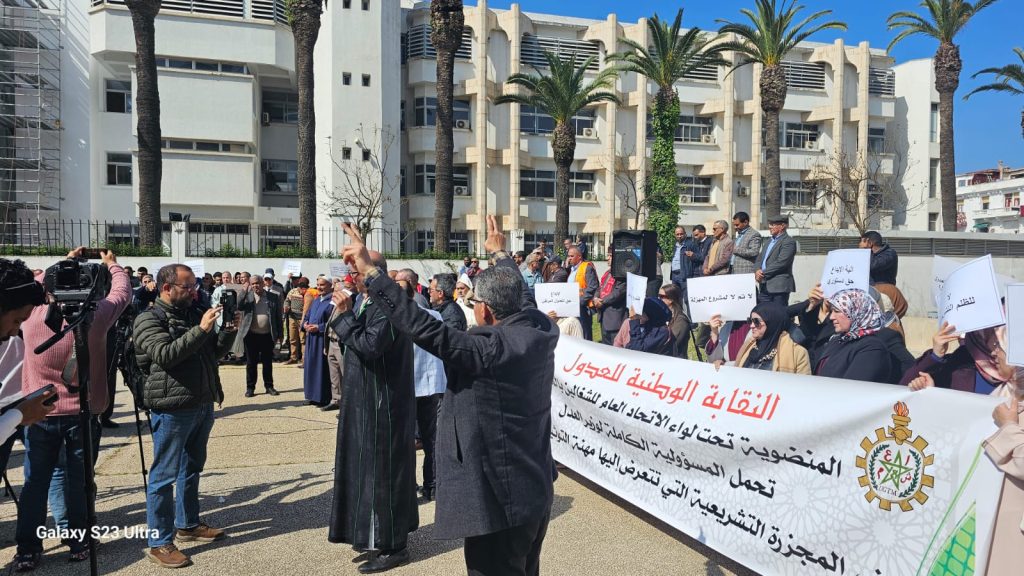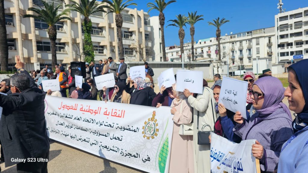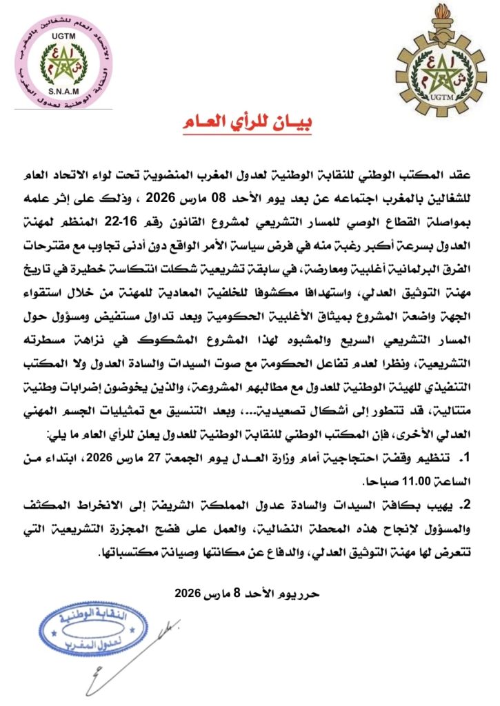 نظمت النقابة الوطنية لعدول المغرب المنضوية تحت لواء الاتحاد العام للشغالين بالمغرب بمختلف فروعها بمدن المملكة وقفة أمام وزارة العدل احتجاجا على مشروع القانون 16.22 المنظم لمهنة العدول وكانت النقابة قد دعت لهذه الوقفة في بيان لها بتاريخ 08/03/2026 بعد أن علم المكتب الوطني للنقابة بمواصلة القطاع الوصي للمسار التشريعي لمشروع القانون رقم 16-22 المنظم لمهنة العدول بسرعة أكبر، دون أدنى تجاوب مع مقترحات الفرق البرلمانية أغلبية ومعارضة.