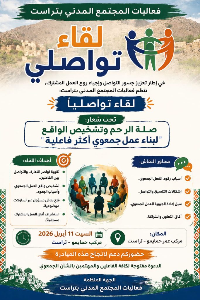 في إطار تعزيز جسور التواصل وإحياء روح العمل المشترك بين مختلف الفاعلين الجمعويين تستعد فعاليات المجتمع المدني بمنطقة تراست لتنظيم لقاء تواصلي هام يحمل دلالات قوية نحو توحيد الرؤى وتبادل الخبرات.