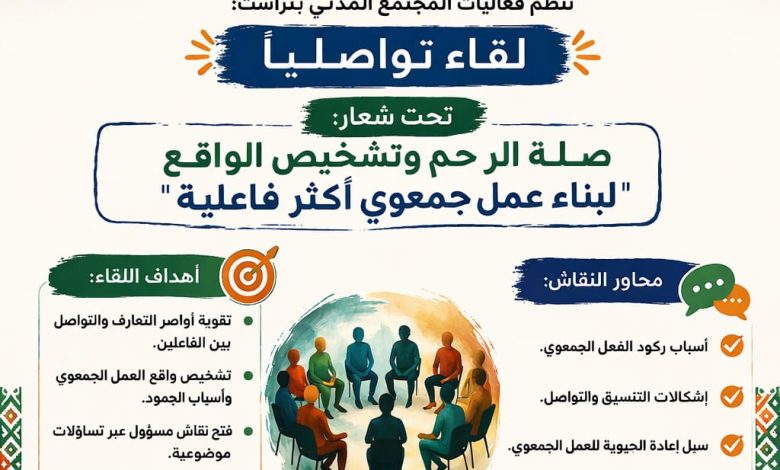 وأكدت الجهة المنظمة أن هذا اللقاء يندرج ضمن سلسلة من المبادرات الرامية إلى خلق فضاء للحوار البناء وتبادل الأفكار والتجارب بما يسهم في تقوية النسيج الجمعوي وتعزيز أدواره في خدمة المجتمع.