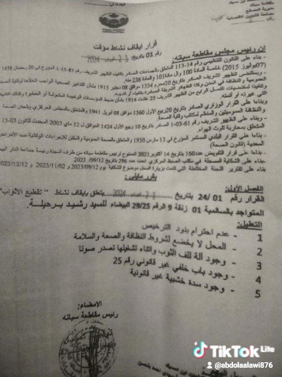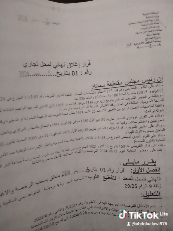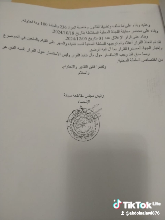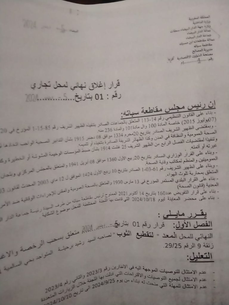 فالقرار الإداري الصادر عن رئاسة مجلس مقاطعة سباتة، والمدعوم بتقارير معاينة ومقتضيات قانونية واضحة، يفترض فيه أن يتم تنفيذه بشكل فوري، باعتباره إجراء قانوني نهائي يهدف إلى حماية النظام العام وصون حقوق الساكنة.