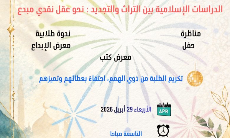 يستعد طلبة شعبة الدراسات الإسلامية بكلية الآداب والعلوم الإنسانية بنمسيك – الدار البيضاء، لتنظيم اليوم الثقافي الطلابي السنوي يوم الأربعاء 29 أبريل 2026 بفضاء عبد الله العروي، تحت شعار: “الدراسات الإسلامية بين التراث والتجديد: نحو عقل نقدي مبدع”.