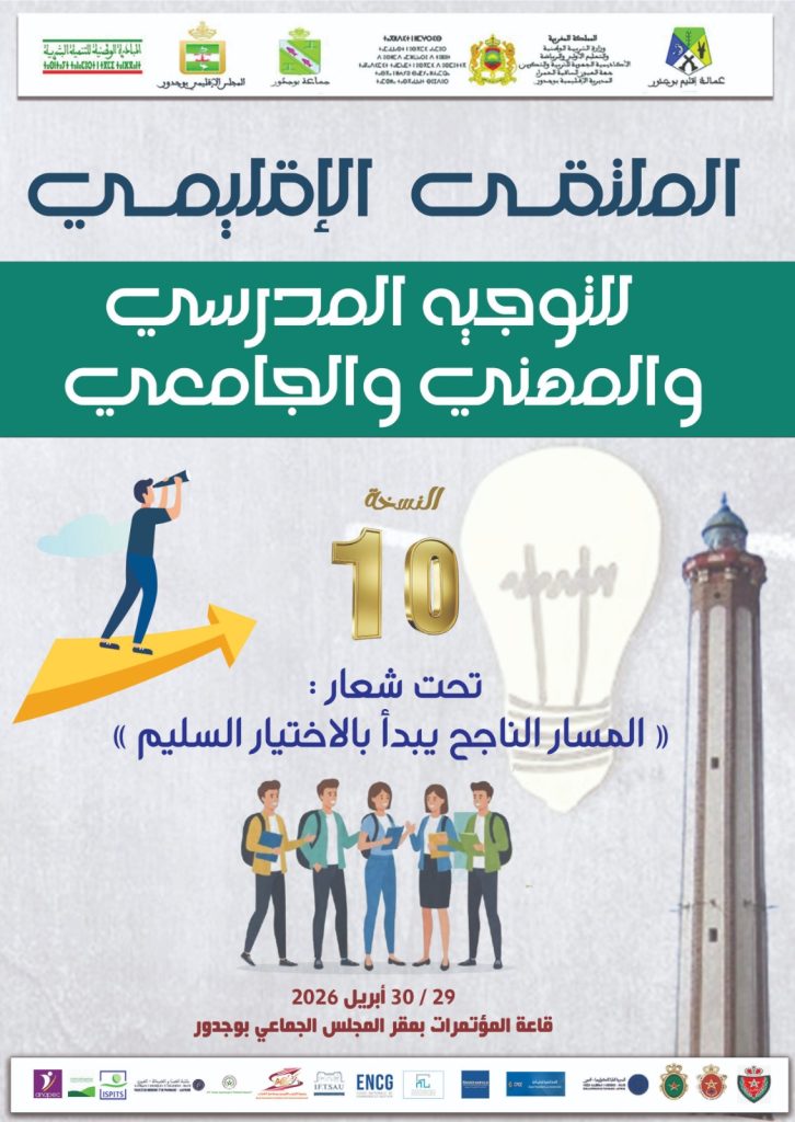 تحت شعار “المسار الناجح يبدأ بالاختيار السليم”، تحتضن قاعة المؤتمرات بمقر المجلس الجماعي بوجدور يومي 29 و30 أبريل 2026 فعاليات الملتقى الإقليمي للتوجيه المدرسي والمهني والجامعي بمشاركة عدد من الفاعلين التربويين والخبراء في مجالات التوجيه والتكوين.